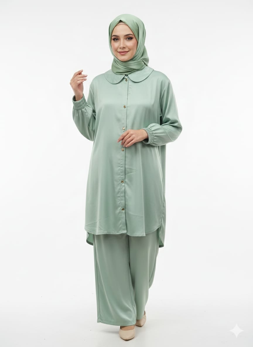 Experience the perfect blend of modern sophistication and traditional grace. Our Serene Sage Co-ord Set is crafted from premium Cherry Fabric, known for its exquisite silk-like drape, breathable texture, and a subtle matte-satin finish that catches the light beautifully.